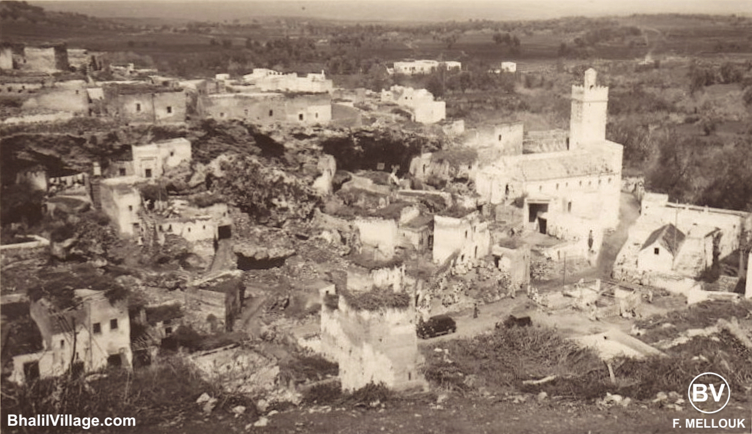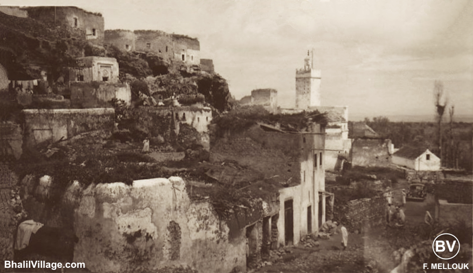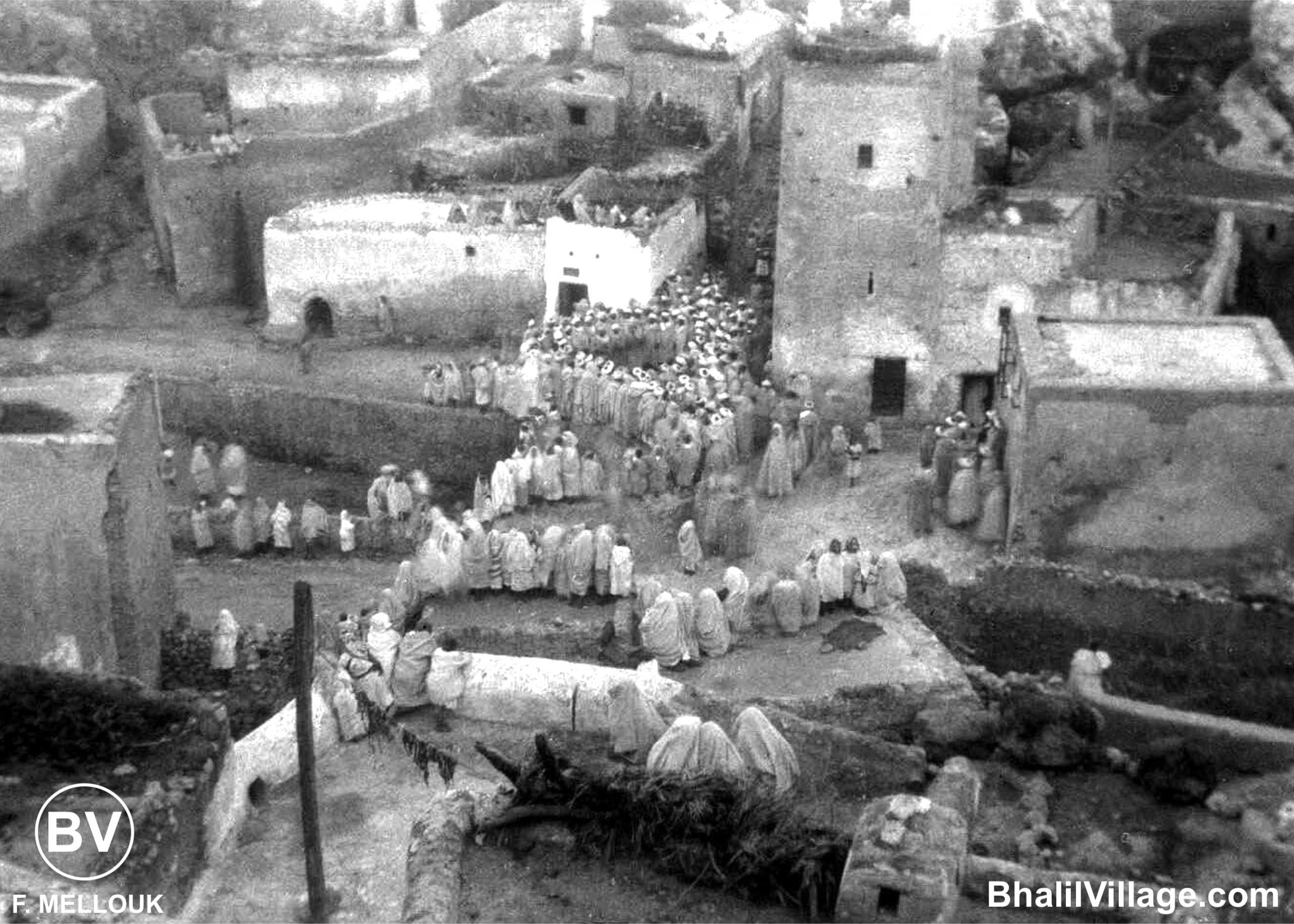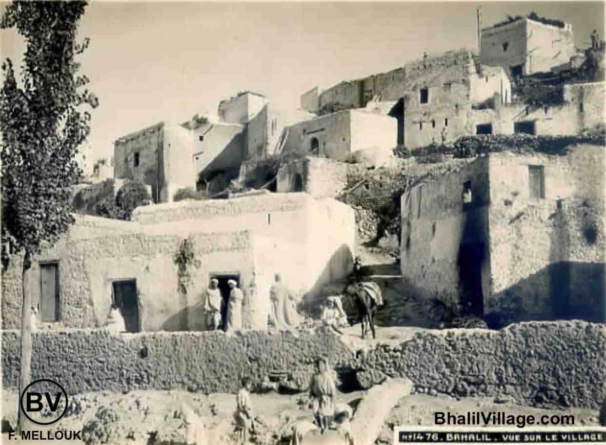 🔹 Des photos en noir et blanc datant probablement de la même époque que les cartes postales, ont été publiées à droite et à gauche sur internet. Je n'arrive pas à savoir qui les a prises ni de quelle année elles datent. Je les ai juste remise en forme avec Affinity Photo pour qu'elles soient plus présentables dans ce site. Dépoussiérage, retouchage, ajustement lumière, découpage des parties inutiles, encadrement etc... Bhalil Village mérite quelques efforts supplémentaires !