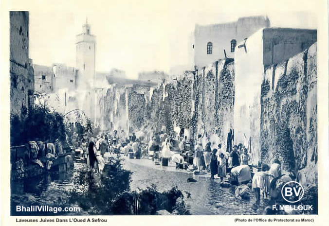 🔹 Nouvelles photos anciennes. Particulièrement les photos n° 14 et 15 qui viennent de sortir sur le site Bhalil Village après acquisition. Prise par le même photographe dont le nom est inconnu, elles datent probablement du début des années 20 du siècle dernier. L'argument en faveur de cette datation au « Carbone 14 » est l'apparition en arrière plan de la photo 14 des premières salles de l'école primaire de Bhalil. Anciennement appelée « École Musulmane de Bhalil » et renommée plus tard « École El Wahda ». Rappelons que cette école a été construite en 1920 à l'époque coloniale. On peut lire sur sa Plaque Commémorative (en arabe) l'évolution de l'école avec le temps jusqu'en 1979. La photo d'origine de la plaque a été fournie par Mr. Abdeslam El Merrouni (Ancien instituteur de l'école). Par ailleurs sur ces images on voit l'apparition des premières voitures dans le village. Certainement celles des visiteurs, des notables, des fonctionnaires ou des officiels de l'administration française du protectorat. L'histoire ne dit pas s'il y avait des garages à l'époque dans ce qui ressemblait fort bien à un champ de ruines. Quelques décennies plus tard on voit clairement que le visage de Bhalil a changé (photos 13 et 16). Visiblement, une reconstruction a eu lieu, suite à la crue de 1950. Les petits ponts, le nouveau hamam, le nouveau lavoir et peut-être le nouveau dispensaire (au centre de la photo 13) ont fait leur apparition. Les laveuses musulmanes de Bhalil (photo 16) ressemblaient beaucoup aux Laveuses juives de Sefrou, telles qu'elles ont été décrites, photographiées et peintes à maintes reprises. Le lavoir et les laveuses de Bhalil sont moins connus. Ni cartes postales, ni photos professionnelles, ni Tableau au Musée d'Orsay à Paris. Malheureusement, on dirait que Joseph-Félix Bouchor (1853-1937) a oublié de passer par Bhalil. Le documentaire Moroccan Village (British PATHÉ 1960) montre les laveuses de Bhalil mais sans nommer le village. Confusion totale avec Chefchaouen plus au Nord dans les montagnes du Rif. On peut cependant se consoler avec une photographie professionnelle inédite, datant probablement des années 30, et réalisée vraisemblablement par le service photographique de la résidence générale en même temps que certaines photos de Sefrou et sa région. La photo est numérotée 1476, et identifie clairement les lieux. Il n'y a cependant aucune indication au verso. On y voit très bien le flanc de la falaise sud d'El Khandaq avec le four public à droite. La porte de ce dernier est complètement noircie par la fumée. Ce côté de la vallée a été souvent oublié par les photographes. Tout comme les laveuses. Pour découvrir en exclusivité cette photo restée longtemps cachée, cliquez sur la vedette du jour qui a couté nettement plus cher à l'achat : le Flanc de la Falaise Sud. Le site Bhalil Village vous la livre ici gratuitement, à seulement 72 dpi !