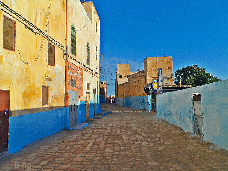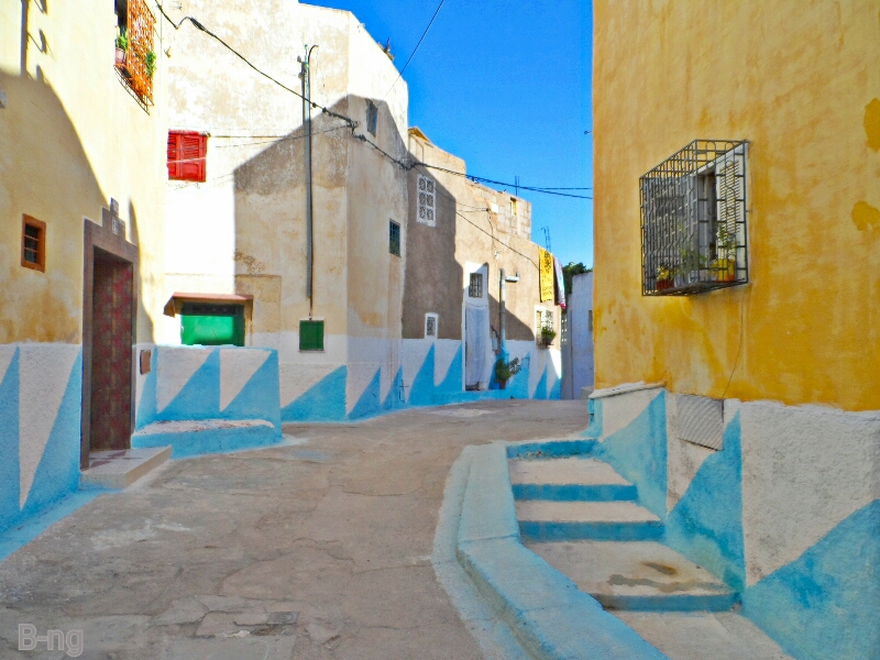 🔹 La tendance africaine ou le style africain en terme de couleurs à Bhalil, me parait beaucoup plus accentuée si on regarde de près d'autres endroits du village. Que ce soit au niveau des rues, des portes ou des fenêtres des maisons, le virage vers les couleurs fortes se confirme de plus en plus. Un style que je n'avais pas connu jadis. Celà me rappelle l'appartenance continentale de Bhalil. On est bien en Afrique. Quant à l'influence du continent sur les couleurs de Bhalil, celà me semble actuellement discutable. Peut-être aussi que les gens de Bhalil ont de nos jours plus de moyens pour peindre en couleurs. Habituellement la peinture couleur est plus chère que le blanc. Il est également possible que les habitants de Bhalil avaient juste envie de changer de couleurs. Pour le plaisir. Pour connaitre la réponse exacte à cette question hautement stratégique, le mieux serait évidemment de demander aux gens de Bhalil eux même. Genre : "excusez-moi, pouvez-vous m'expliquer le choix de ces quatres couleurs sur la façade de votre maison ?". Sinon, une question à 2 couleurs : "excusez-moi, pourquoi avez-vous choisi de peindre les murs en rouge tomate et la porte d'entrée en violet ?"
